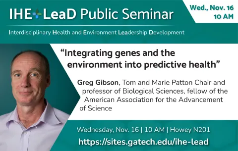 Join us for a public seminar hosted by the Interdisciplinary Health and Environment Leadership Development (IHE-LeaD) program. Greg Gibson, Tom and Marie Patton Chair and professor of Biological Sciences and fellow of the American Association for the Advancement of Science, will give his talk entitled “Integrating genes and the environment into predictive health.”