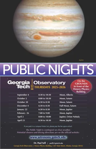 Stargazers are invited to the Georgia Tech Observatory’s Public Nights for a close-up glimpse of the Moon, Jupiter, Saturn, and other night-sky wonders. Public Nights, which are held on select Thursday evenings, are free and open to everyone.