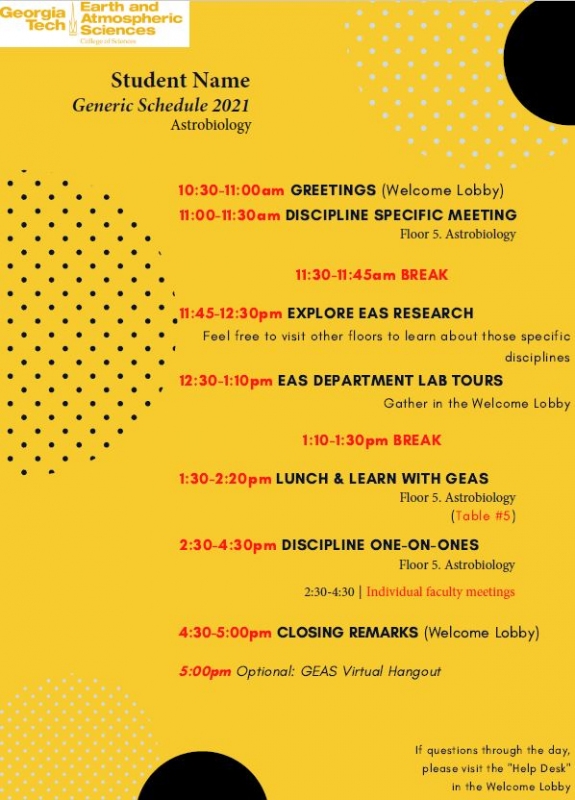 On this visit day, applicants participate in an opening session, lunch with current students, tour EAS facilities and meet with faculty to discuss research and research topics (see sample schedule below).
